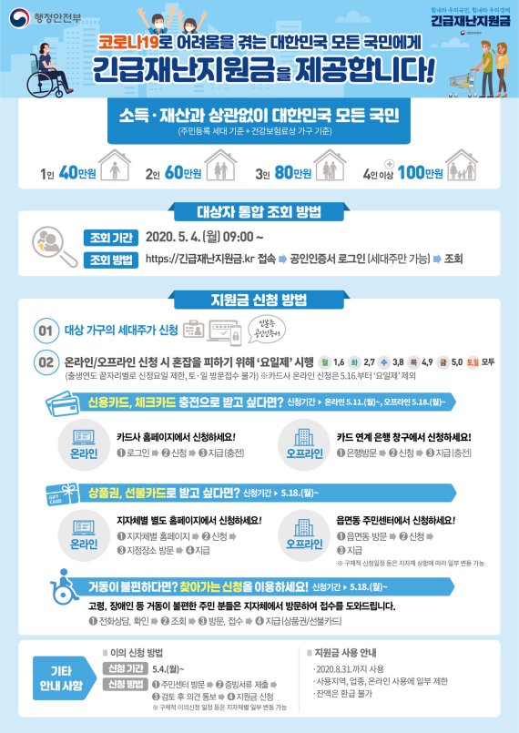 11일부터 카드 재난지원금 신청 가능, 이번 주는 출생연도 5부제 적용 아동돌봄쿠폰, 경기도 재난기본소득 등 여러 지원금 하나의 카드로 사용 가능 세대주가 사는 지역 내에서만 사용.